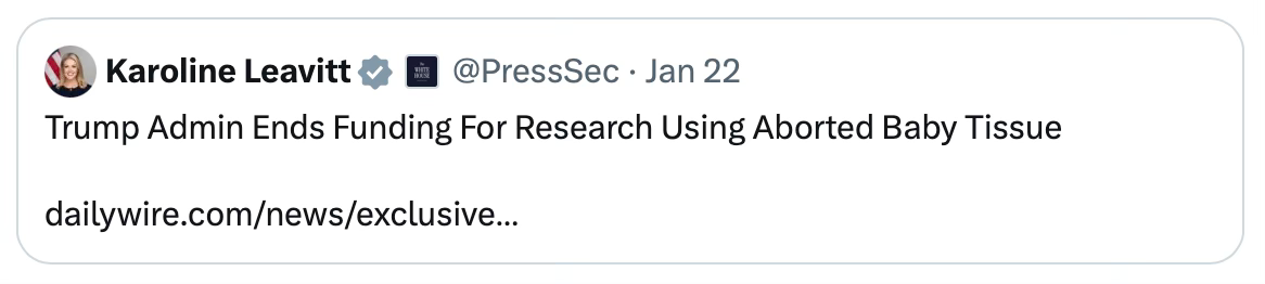 The current administration just ended funding for research using aborted baby tissue. Here is the press secretary’s tweet: