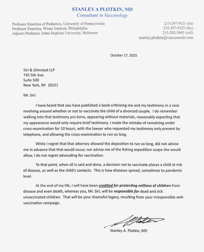 Eight Years After Deposing Dr. Plotkin, the “Godfather of Vaccines,” He Sends Me a Letter