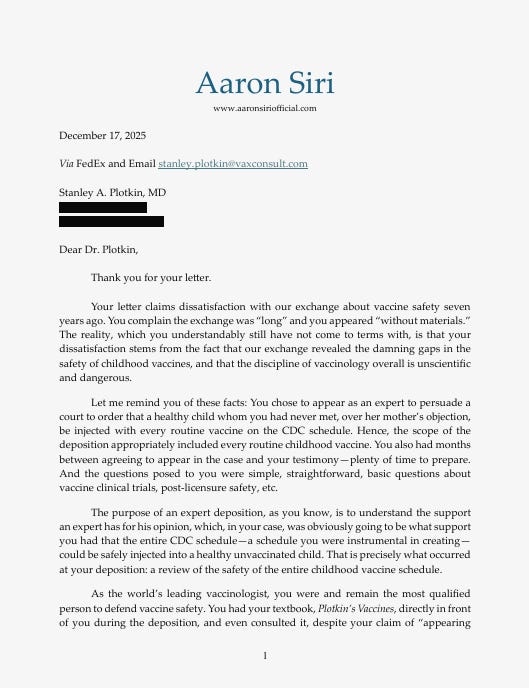While the deposition, as he once wrote, was “traumatic” and “exhausted” him, my book has clearly pushed him far over the edge. Yet, again, and unsurprisingly, his only response, as you will see in his letter, is not about the substance of the book, but rather about how he (the world’s leading vaccinologist) needed more time to prepare for the deposition and that it went too long.