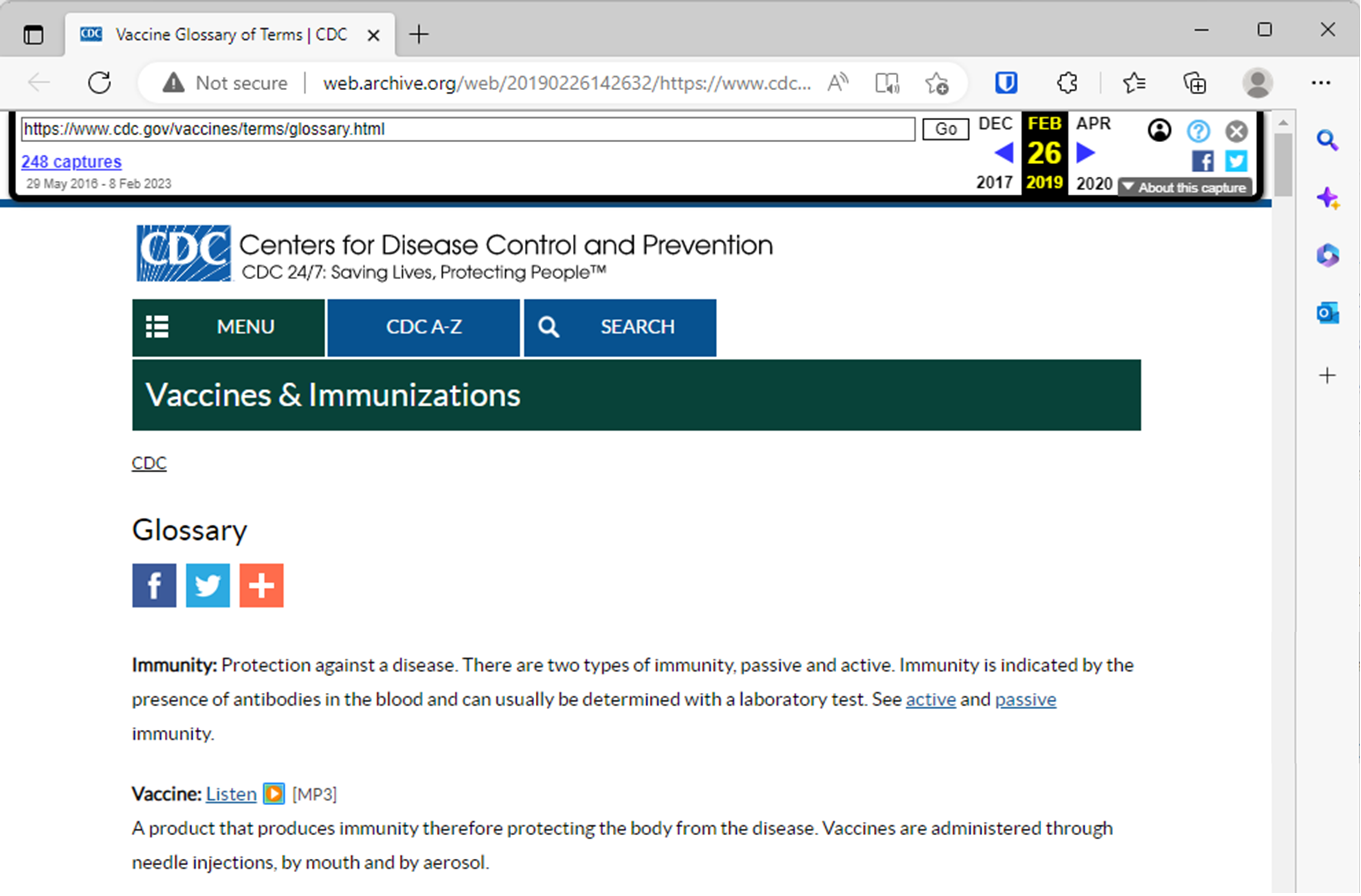 This CDC Glossary of terms for “Vaccines & Immunizations” has been my go-to glossary for over half a decade when quoting the CDC’s definition of vaccine-related terms (for example, see page 100 of this December 2019 complaint) and the pre-Covid definition of “vaccine” and “immunity” is the same for as far back as the WayBackMachine has copies of this page, back to May 29, 2016.