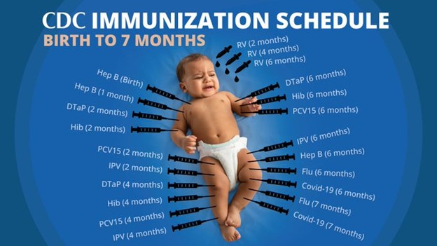 Consider that the rate of chronic health issues among children is reported to have gone from around 11% of children in 1986 (when there were three routine childhood vaccines) to approximately 50% now (with seventeen vaccines on the childhood vaccination schedule). This image is the current schedule for babies up to just 7 months of age: