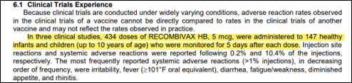 So, 147 children were injected with 5 days of safety monitoring after injection. The clinical trial for Engerix B (see page 6), the other hepatitis b vaccine given to babies, only had 4 days of safety monitoring after vaccination.