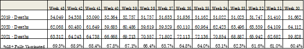 The data on death rates throughout the Government’s brief is also not accurate. (E.g., RIO at 39-40.) There is always a degree of uncertainty as to whether someone died with or from COVID-19, just as there is uncertainty as to the cause of death when someone dies shortly after COVID-19 vaccination. There is, however, a death figure that is not subject to this uncertainty and that is the all-cause-mortality figure: the total number of deaths irrespective of cause. As most adults in the United States became fully vaccinated, the all-cause mortality rate should have declined if the Government’s claims about vaccination in the RIO are correct. But that is not what has happened. The all-cause mortality figure in the United States reveals that once a significant percentage of the American adult population was fully vaccinated, the total deaths in the United States have not declined. The following table provides the CDC’s weekly total deaths in the United States for 2019, 2020, and 2021, starting on week 30 when at least 60% of American adults were fully vaccinated; it reflects that despite this high and increasing level of vaccination, total deaths per week did not return to the levels seen before the pandemic in 2019: