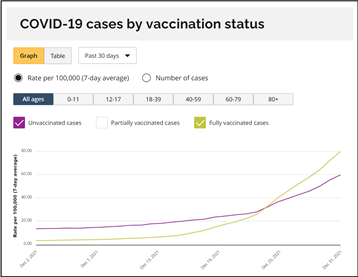 Further bringing this fact into sharp focus is the most recent official government data from Canada, which now shows that vaccinated individuals are more likely to be infected with the COVID-19 virus than unvaccinated individuals. The CDC has not published recent data on infection rates between vaccinated and unvaccinated individuals, and hence the need to rely on our neighbor to the north. For example, the official government data from Ontario, Canada, establishes that as of December 31, 2021, there were 80 Covid infections per 100,000 fully vaccinated individuals versus only 60 Covid infections per 100,000 unvaccinated individuals: