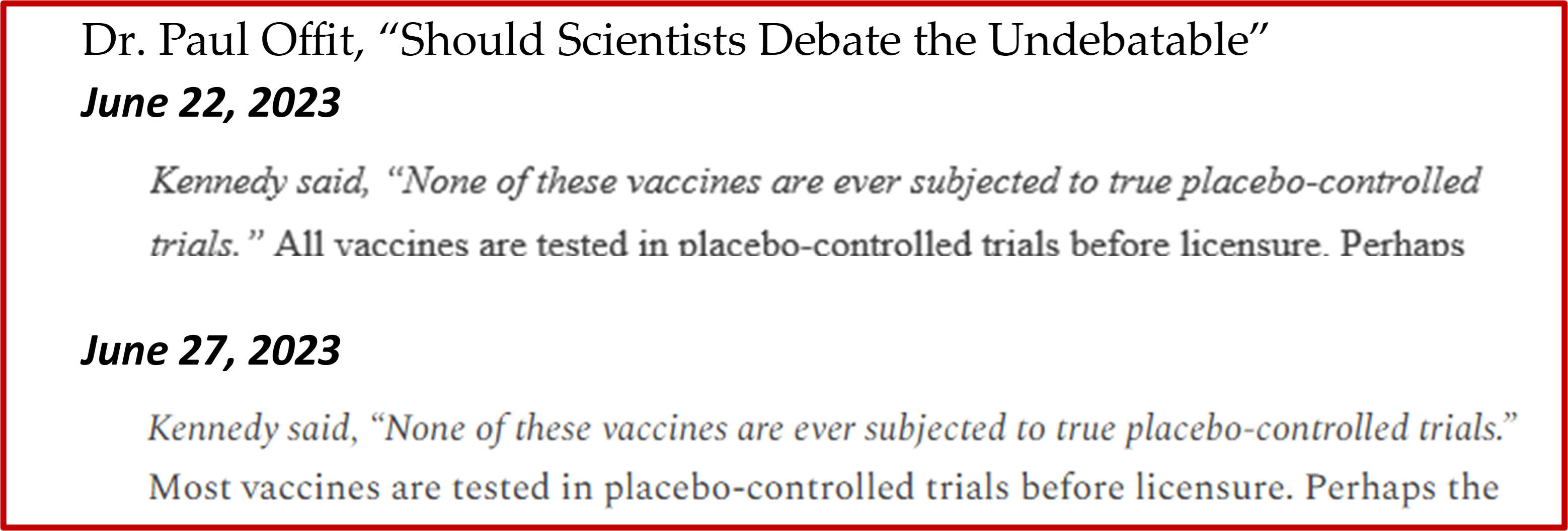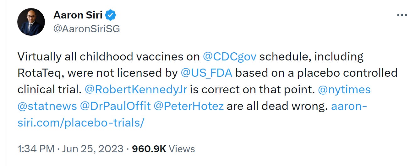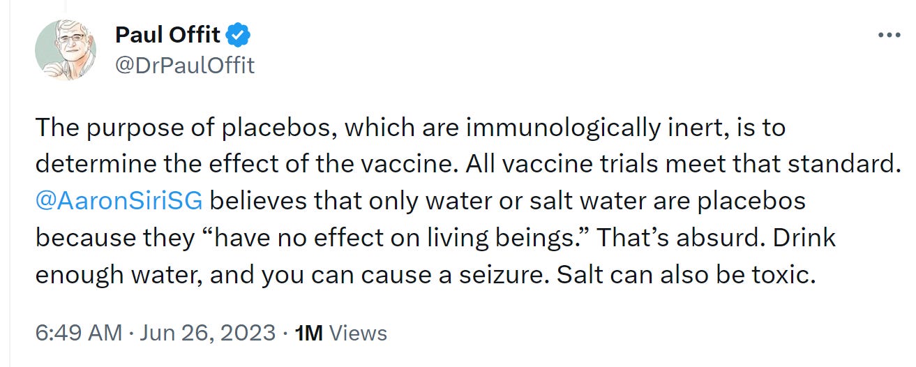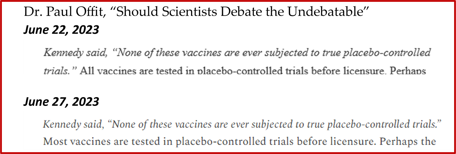 Dr. Offit penned an article attacking Robert F. Kenney Jr. in which Dr. Offit claimed, “All vaccines are tested in placebo-controlled trials before licensure.” Dr. Offit’s claim is categorically false.