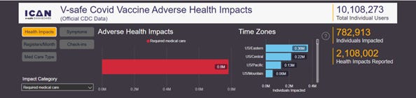 For example, of the 10,108,273 registered v-safe users, 782,913 reported needing medical care after vaccination. So, you divide 782,913 by 10,108,273 and, poof, you now know that 7.7% of all registered v-safe users sought medical care at least once following vaccination. You can see these numbers for yourself on the ICAN v-safe dashboard: