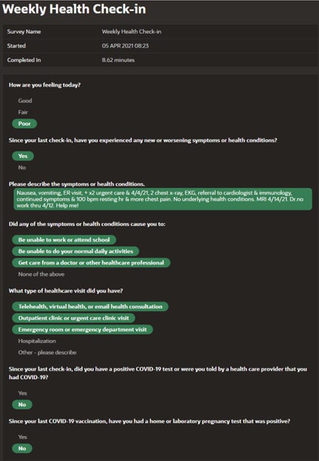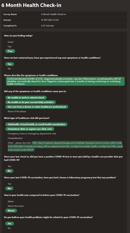 Her pleas for help continued with every health check-in over the next few months which detailed serious and worsening medical condition from the vaccine and still no follow-up from the CDC. See her 6-month check-in below where she notes “still no response from CDC”: