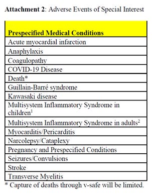 In Part 2 of this Substack series, we discussed how the CDC failed to include check-the-box options for the serious harms it labeled “Adverse Events of Special Interest” and listed in a chart under the header “Prespecified Medical Conditions.” The adverse events of special interest listed in this chart included myocarditis, pericarditis, acute myocardial infarction, stroke, GBS, and transverse myelitis, among other events. This chart was in version 2 of the CDC’s v-safe protocol from January 28, 2021. You may recall that v-safe was launched in December 2020.