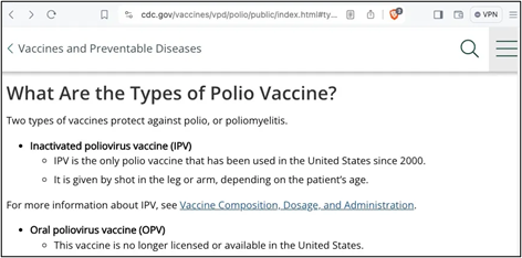 The answer is “No”! The CDC explains that “Inactivated polio vaccine (IPV) is the only polio vaccine that has been given in the United States since 2000” and the CDC further explains that “IPV… protects people from polio disease but does not stop transmission of the virus.” This is because, “IPV induces very low levels of immunity in the intestine. As a result, when a person immunized with IPV is infected with wild poliovirus, the virus can still multiply inside the intestines and be shed in the feces…. IPV does not stop transmission of the virus…”